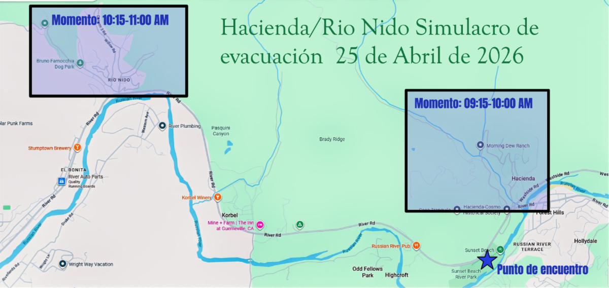 El Departamento de Manejo de Emergencias del Condado de Sonoma, en colaboración con grupos comunitarios de preparación, llevará a cabo un simulacro de evacuación el sábado 25 de abril para las comunidades de Hacienda y Río Nido, situadas en el oeste del condado de Sonoma.